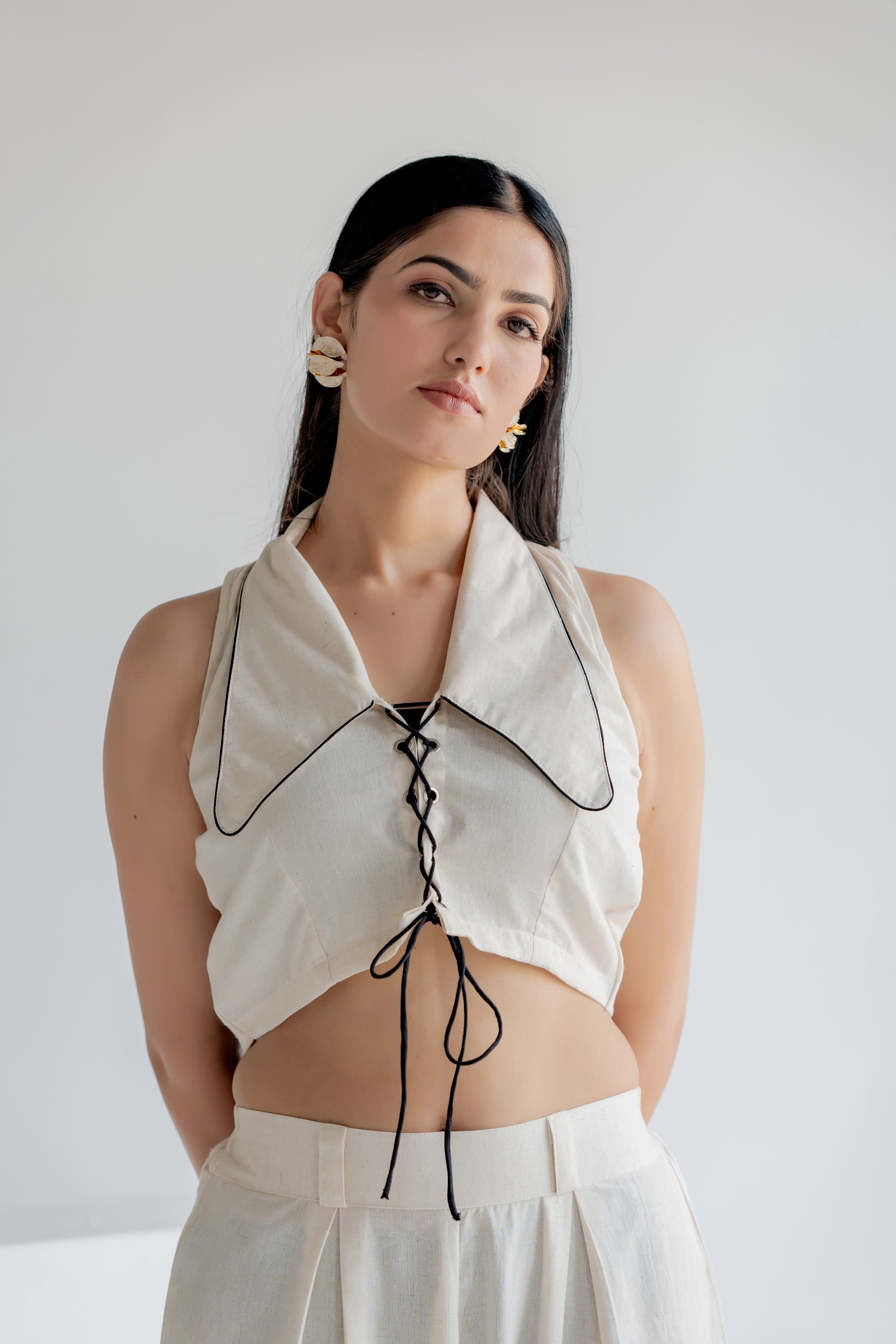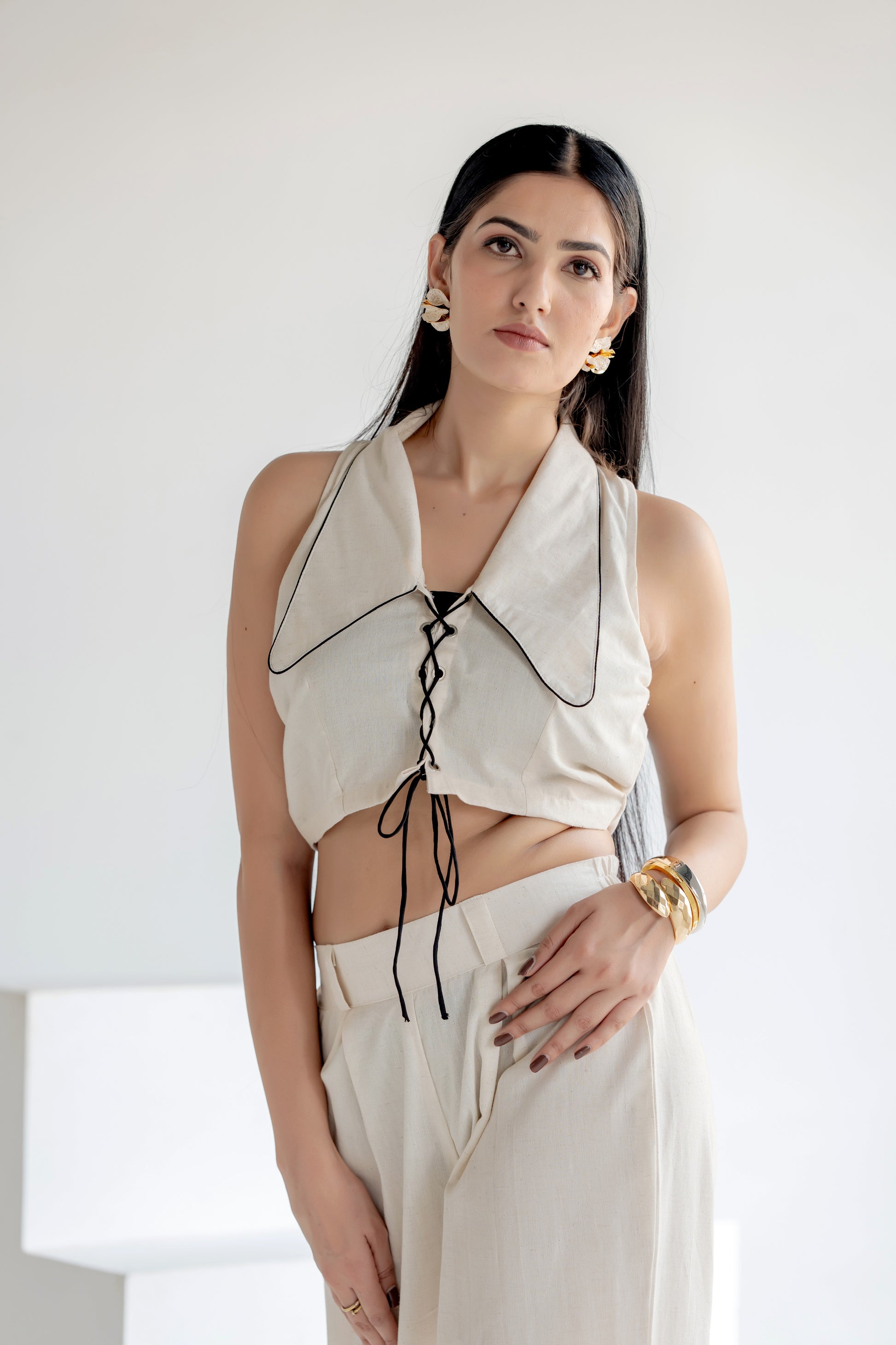 - 2-piece co-ord set: Corset-style top + wide-leg pants