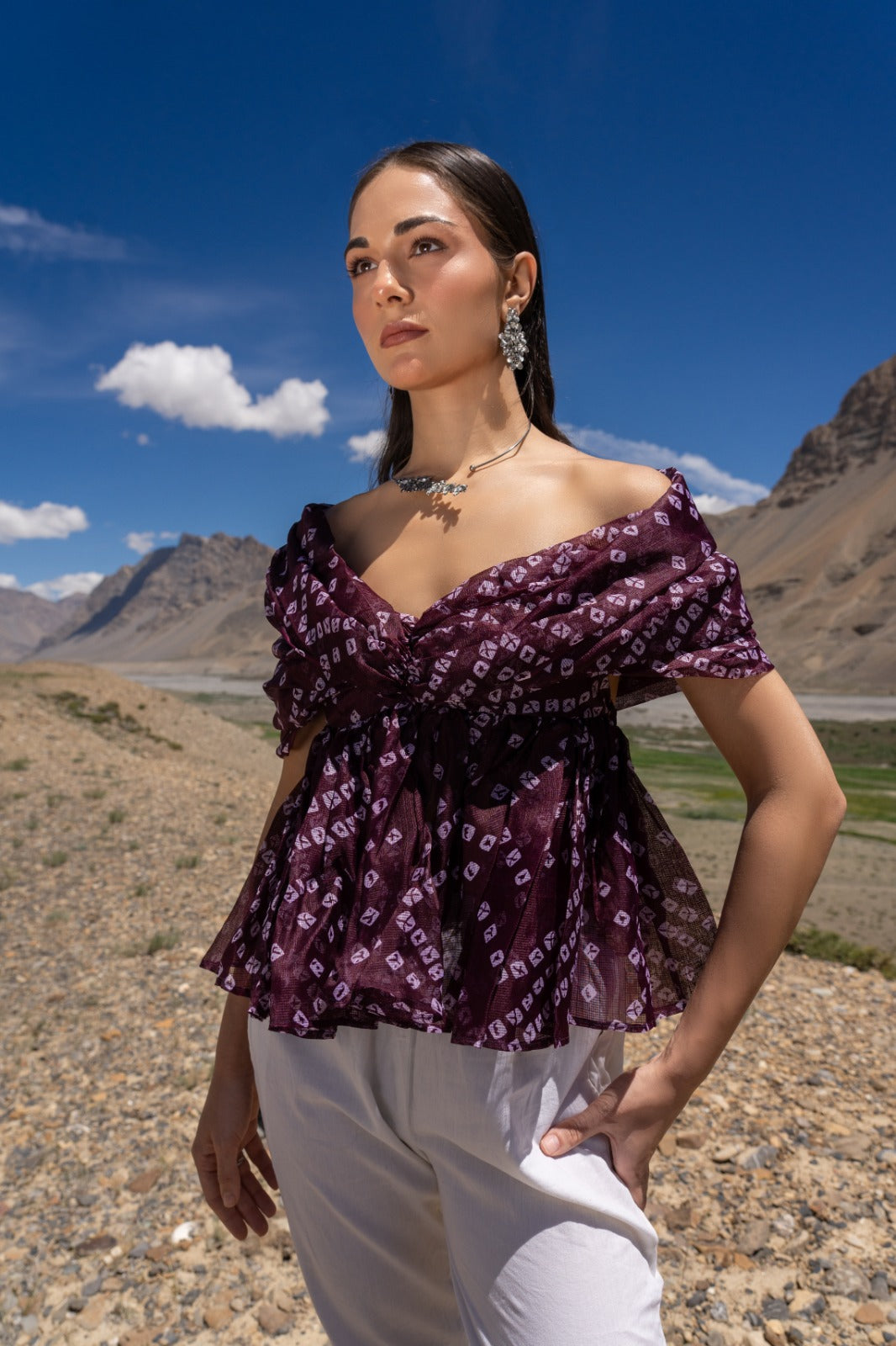 Set against open landscapes, this piece sits between structure and fluidity—where tradition loosens its grip and modern form takes over.Designed as part of a chapter, not a trend, this silhouette drapes softly across the shoulders, allowing movement, air, and emotion to coexist.