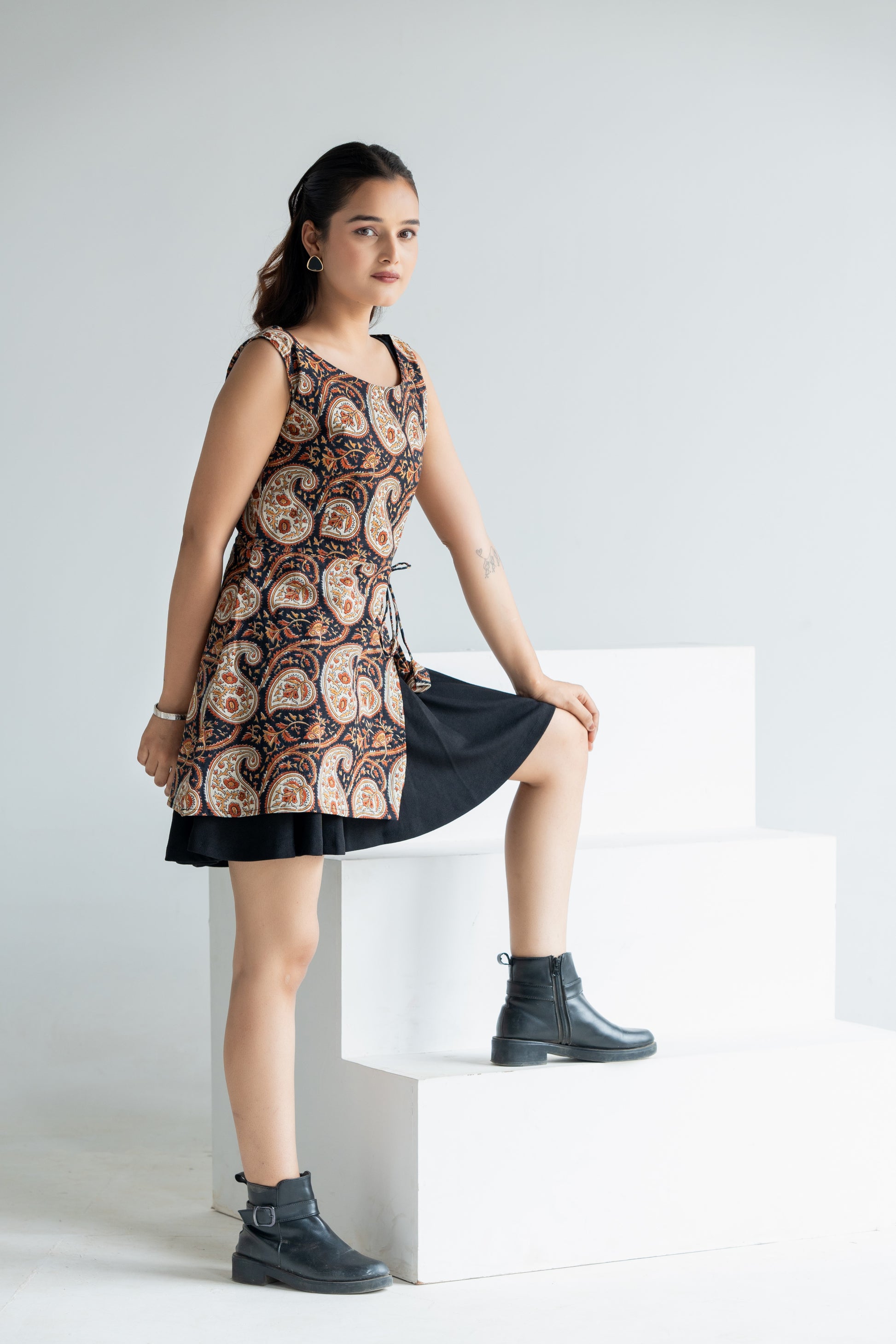 The surface is painted in paisley — not just a motif, but a memory of royal courts and caravan routes. Paired with a solid noir black skirt that flows like ink, it’s modern. Fierce. Soulful.
